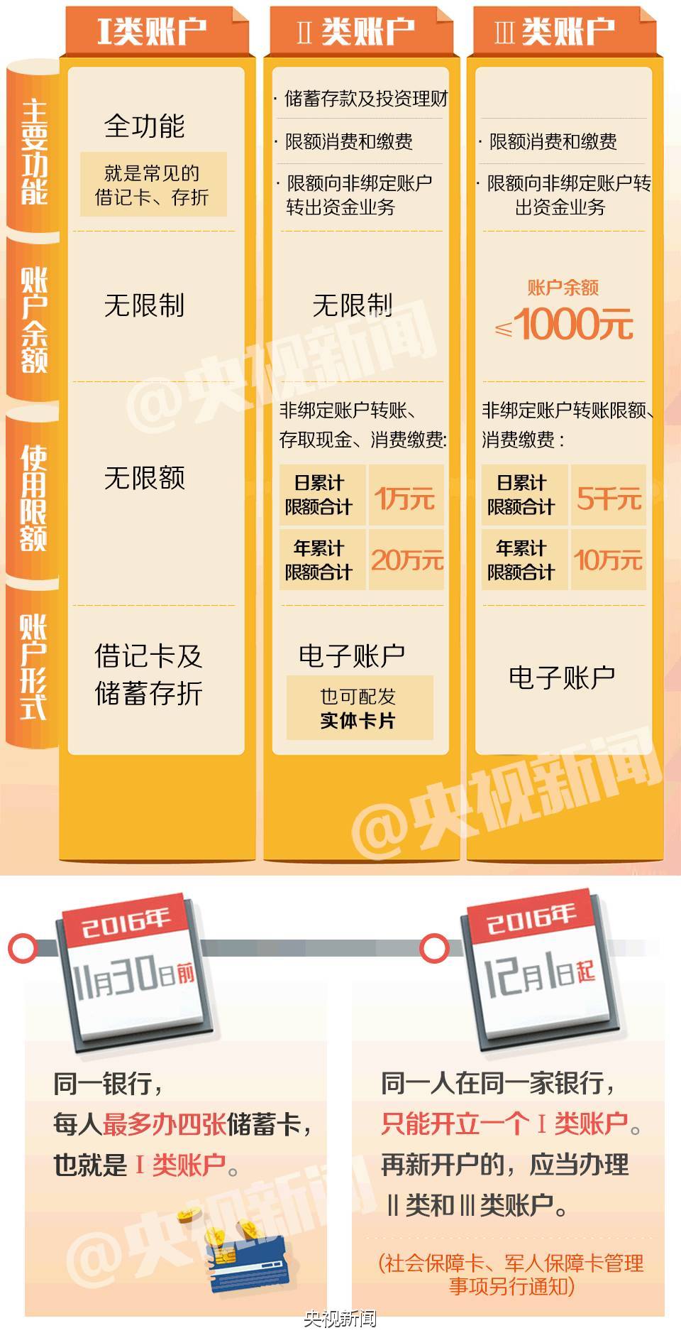 央行日前規定:自12月1日起,個人在銀行開立賬戶,每人在同一家銀行,只能開立一個Ⅰ類戶,如果已經有Ⅰ類戶的,再開戶時只能是Ⅱ、Ⅲ類賬戶。