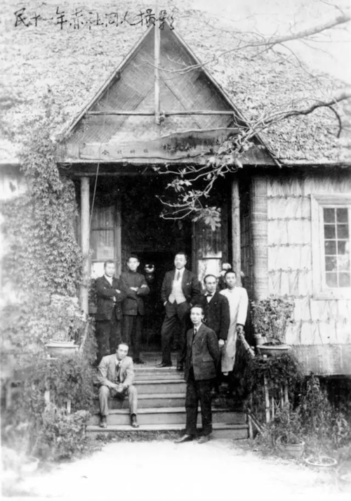 1922年,赤社第二次畫展在廣州中央公園東北邊蓋搭的葵棚舉辦。赤社同仁前排左起:梅雨天(與天)、胡根天;后排左起:梁鑾、盧子樞、陳丘山、馮鋼百、徐守義(東白)