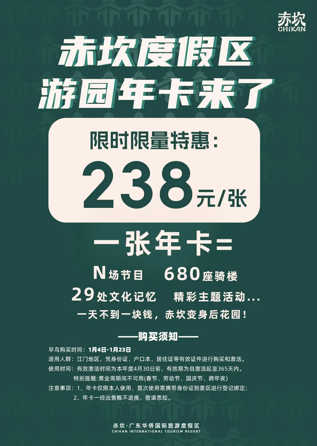 一張年卡=看精彩演藝+玩遍全年主題活動月+全園沉浸式體驗+N /夜游大劇·歸途/ 以上是2025年放送的部分驚喜 2026年期待更多新故事和你見面~ 關于赤坎華僑古鎮景區新一年的年卡, 你肯定還想問—— Q1 今年年卡劃算嗎? 早鳥特惠238元/張。成人門票150元/人,買年卡相當于第二次享7.8折,第三次開始無限次免費游玩啦! ①238元/張早鳥購時間:2026年1月4日-1月23日 ②268元/張恢復市場價購買時間:2026年1月24日-2月15日 Q2 哪些人可以買年卡? ①年卡使用對象僅限江門地區居民,每人限購一張; ②用戶需憑身份證、戶口本、居住證等有效證件進行購買和激活; ③年卡一經激活概不退換,敬請悉知。 Q3 在哪里可以買年卡? ①線下在景區購票窗口處現場購買; ②線上購買可關注本推文評論區置頂信息; ③開售后在抖音、美團、攜程等官方線上店鋪購買。 Q4 年卡買了之后怎么使用? 購買年卡后,首次使用需進行激活人臉識別。激活后以人臉識別的方式入園游玩。 ①擁有江門地區身份證的居民可攜帶本人身份證前來景區售票中心辦理激活; ②如擁有江門地區在住戶口或暫住證的居民,亦可攜帶本人戶口本+本人身份證/本人暫住證+本人身份證到景區售票中心進行登記個人信息辦理激活。 如有疑問可以咨詢赤坎華僑古鎮景區客服:400-0011-922 Q5 年卡有使用期限嗎? ①激活期限:2026年4月30日21:30前,超過期限仍未激活則無法再使用; ②使用期限:自激活日起至往后365天內; ③不適用日期:以下場景不可使用:2026年春節(2月17日-2月21日)、勞動節(5月1日-5月4日)、國慶(10月1日-10月5日)、跨年夜(12月31日)、2027年春節(2月6日-2月10日)。 Q6 小朋友買年卡有優惠嗎? 1.2米以下的小朋友免票入園。高于1.2米的小朋友就要像大朋友一樣購買年卡啦。 Q7 年卡可以借給別人用嗎? 不可以哦,年卡使用方式為人臉識別入園,僅限本人使用~
