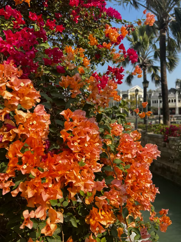 暖冬的陽光灑在花瓣上,折射出細碎的金光,漫步其中,花香縈繞鼻尖,偶爾有搖櫓船從水面劃過,船槳激起的漣漪倒映著花影與碉樓輪廓,宛如一幅流動的僑鄉水墨畫,每一處都是風景。游客們紛紛拍照感受這份獨有的寧靜與美好。