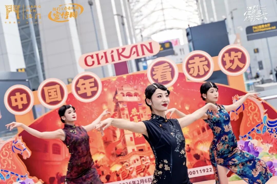 活動(dòng)期間,赤坎華僑古鎮(zhèn)選派《一代宗師》《花樣年華》兩大特色節(jié)目展演,以僑鄉(xiāng)風(fēng)情表演帶動(dòng)現(xiàn)場(chǎng)熱烈氛圍,并設(shè)置 “中國(guó)年?看赤坎” 專題海報(bào),預(yù)告2026年2月6日-3月3日赤坎新春系列活動(dòng),吸引大量旅客駐足了解。