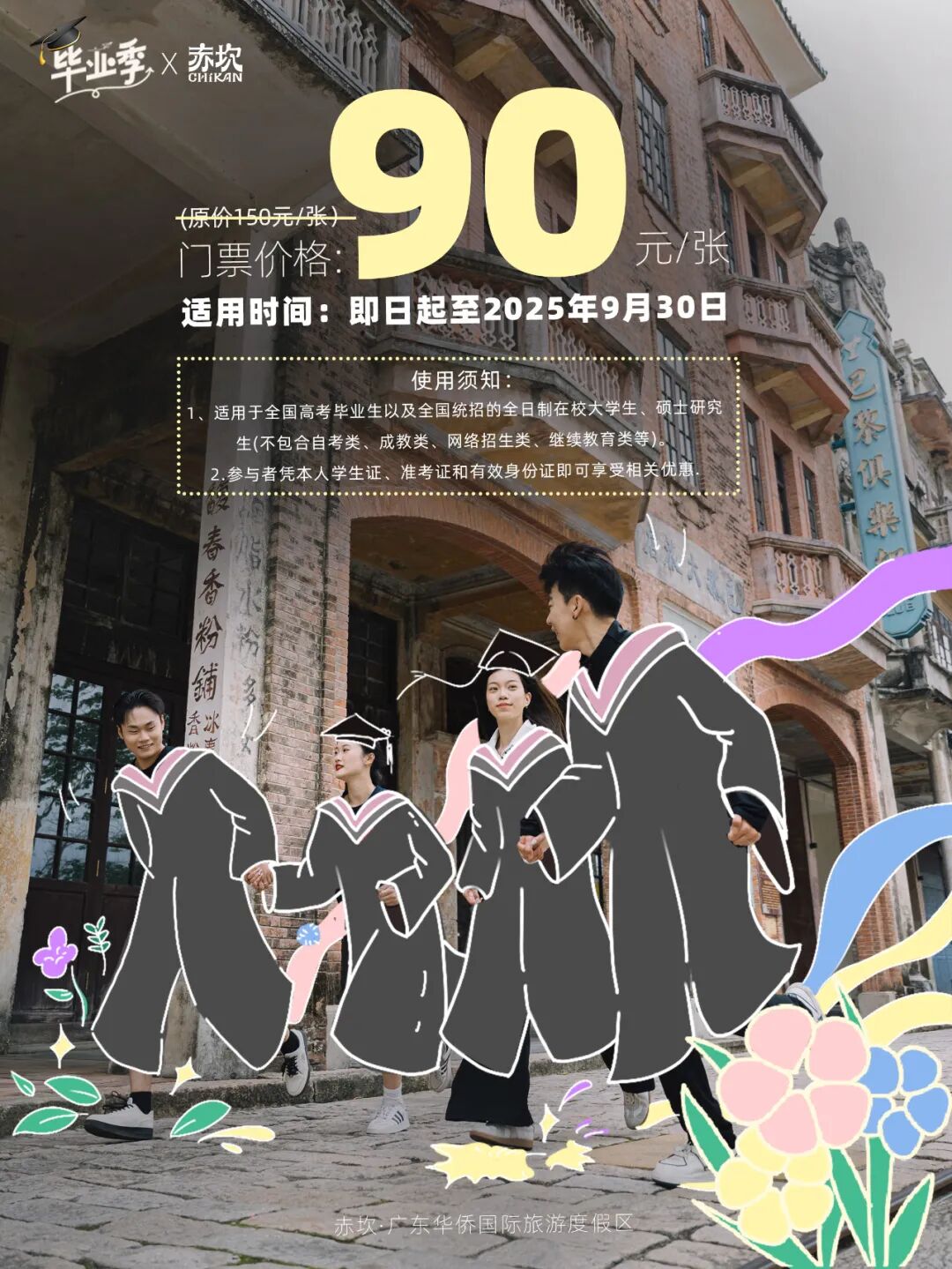 第一件事:對于經濟還未獨立的學子們,赤坎華僑古鎮啟動畢業季限時優惠!今年的全國高考畢業生以及全國統招的全日制在校大學生、碩士研究生可憑有效證件享受畢業季游赤坎限時優惠,僅需90元/人。
