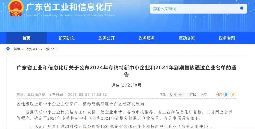 廣東省工業(yè)和信息化廳發(fā)布“2024年專精特新企業(yè)名單通告”,