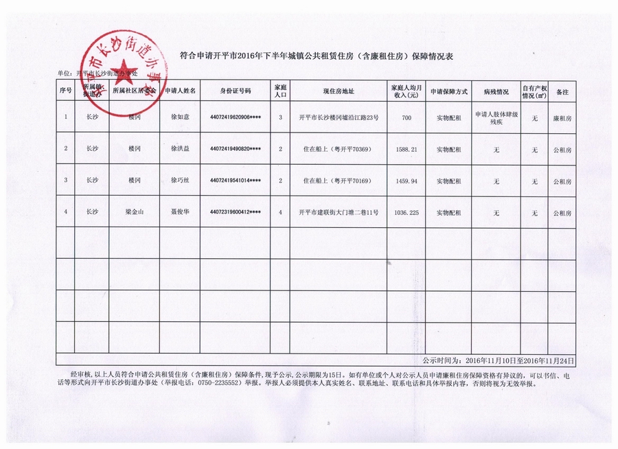 長沙街道符合申請開平市2016年下半年城鎮公共租賃住房(含廉租住房)保障情況表