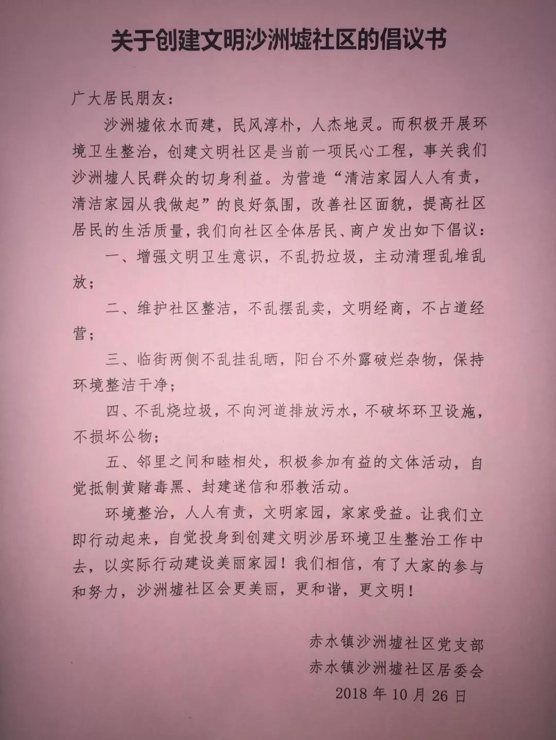活動(dòng)中,黨員們還向群眾派發(fā)了《創(chuàng)建文明沙洲墟社區(qū)倡議書(shū)》,向群眾宣傳維護(hù)環(huán)境衛(wèi)生舉措,增強(qiáng)群眾環(huán)境保潔意識(shí),形成長(zhǎng)效機(jī)制。
