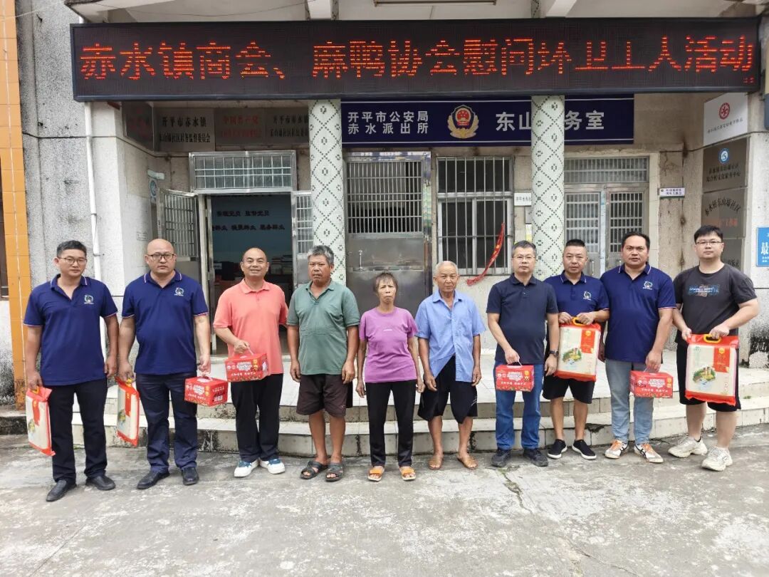 持續高溫給環衛工作帶來嚴峻“烤”驗,8月14日上午,赤水鎮聯合鎮商會、開平市麻鴨產業協會開展“送清涼”慰問活動,向全鎮20余名一線環衛工人贈送“赤水優品”禮包(含山楂醋、大米等物資)。黃大勇、張曉冉以及麻鴨產業協會會長、商會代表樊勁松等參加慰問。