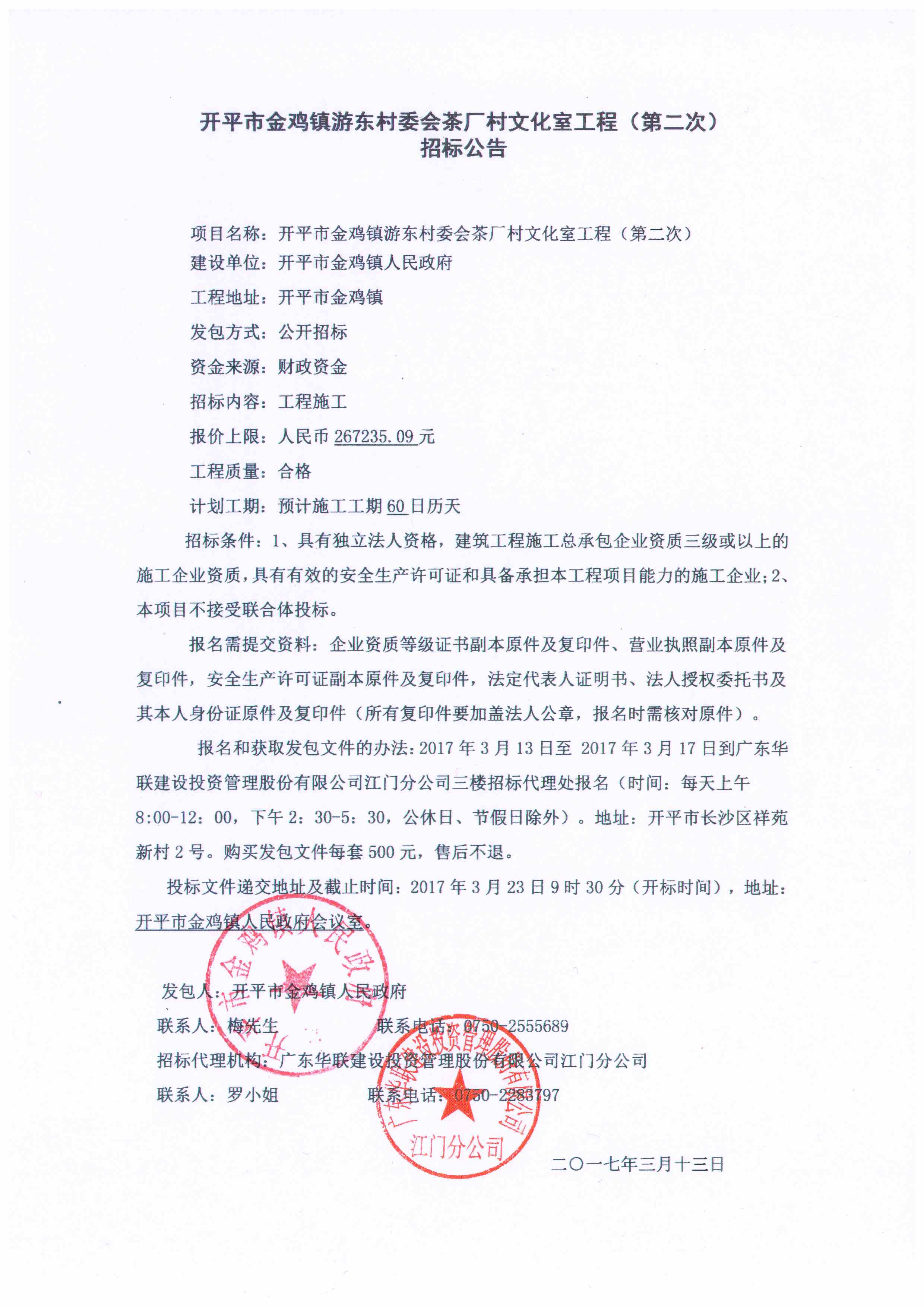 開平市金雞鎮(zhèn)游東村委會茶廠村文化室工程(第二次)