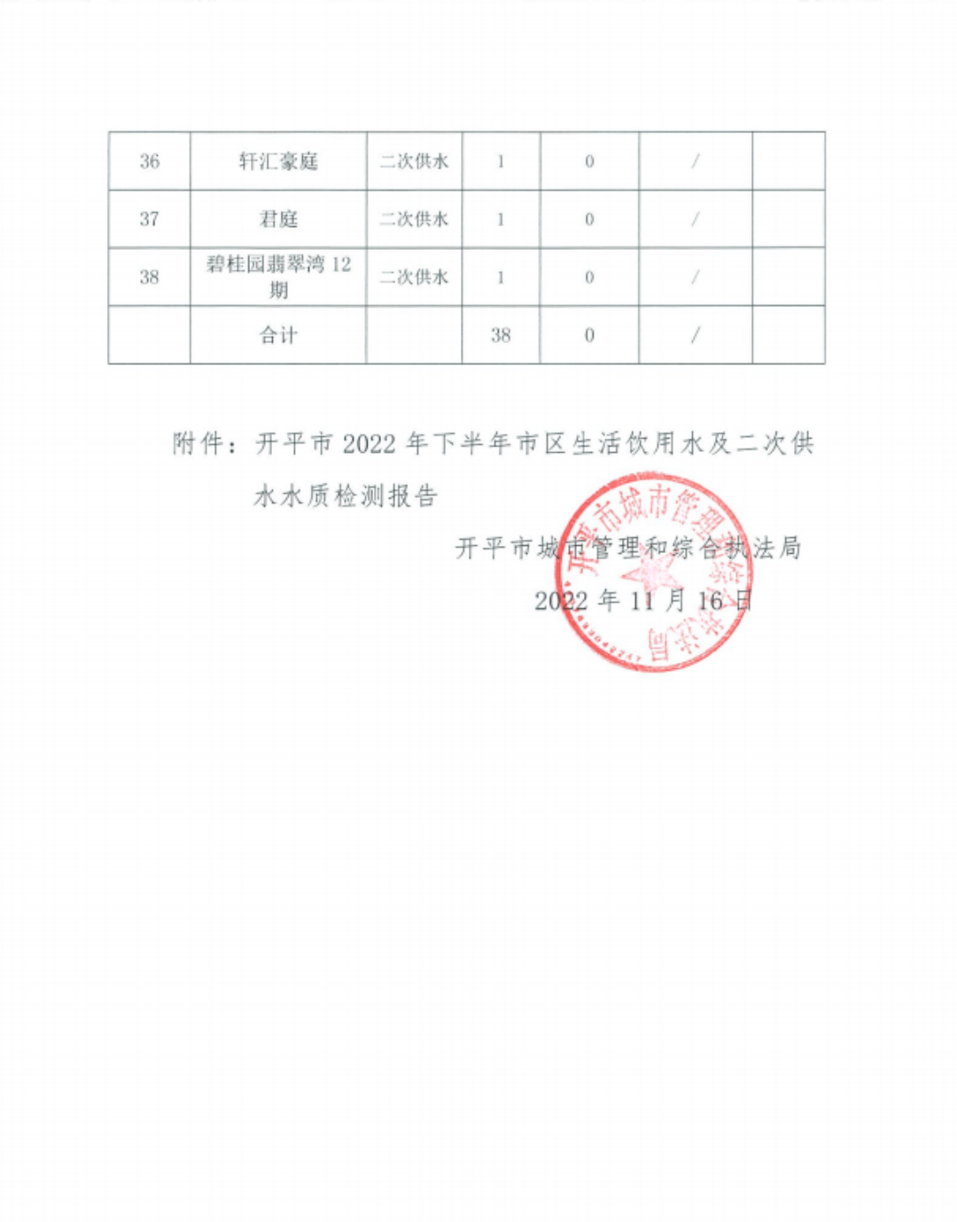 開平市2022年下半年市區生活飲用水及二次供水水質檢測信息公示