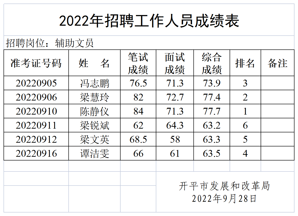 現將開平市發展和改革局招聘工作人員綜合成績予以公布,綜合成績合格分數線為60分。