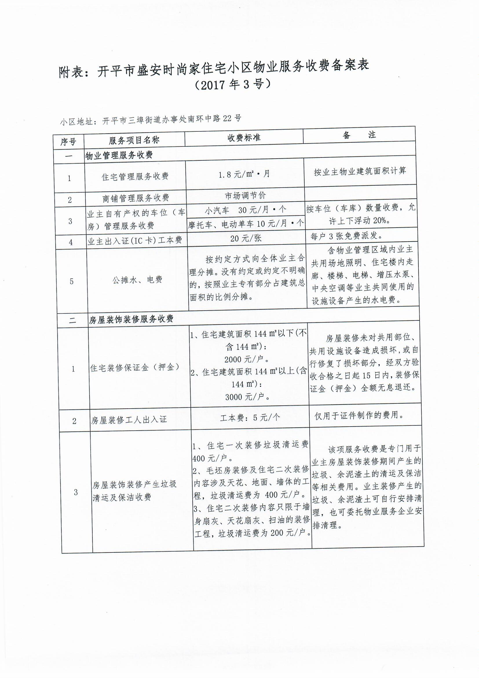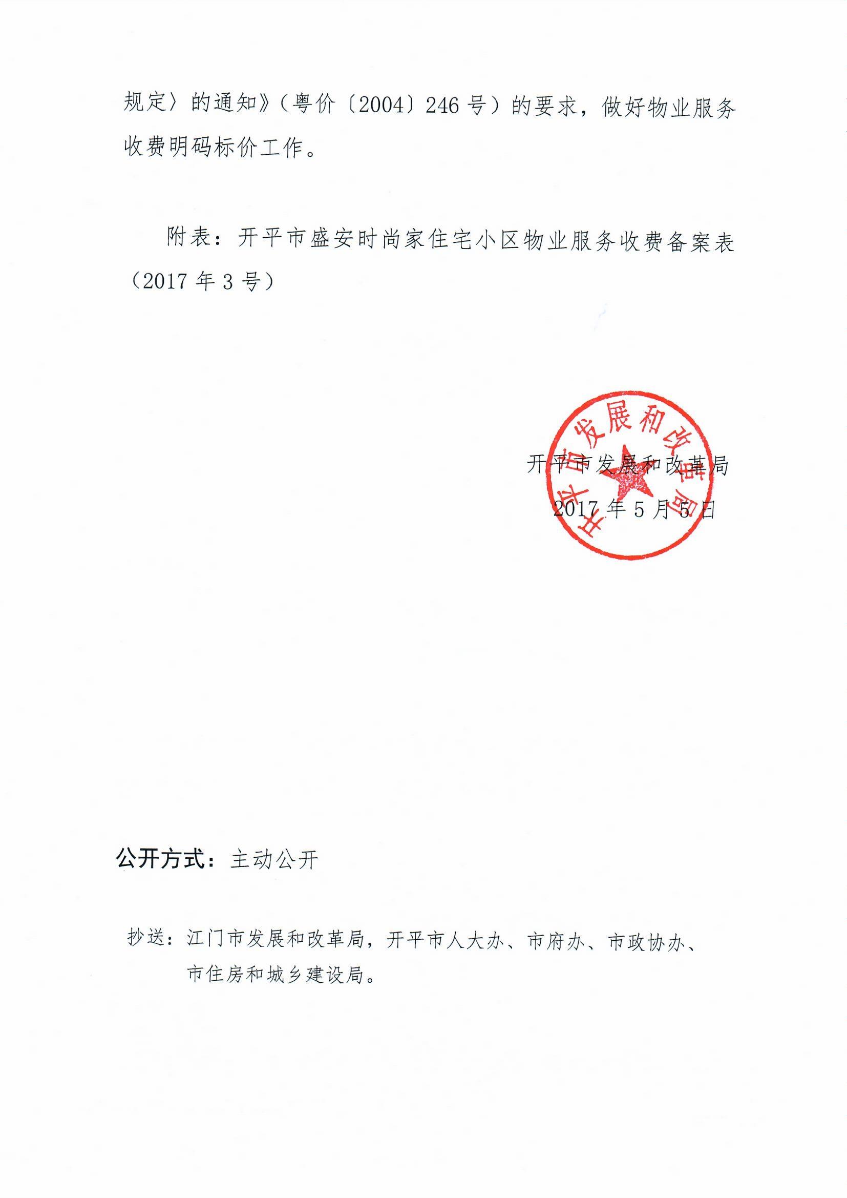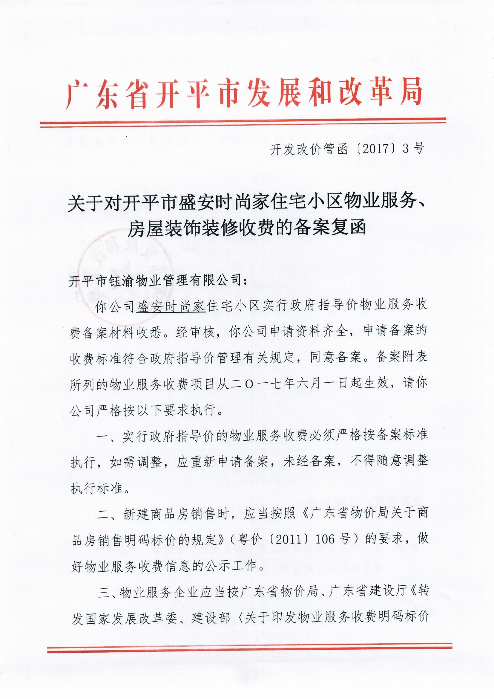 開發(fā)改價(jià)管函〔2017〕3號(hào) 關(guān)于對(duì)開平市盛安時(shí)尚家住宅小區(qū)物業(yè)服務(wù)、房屋裝飾裝修收費(fèi)的備案復(fù)函