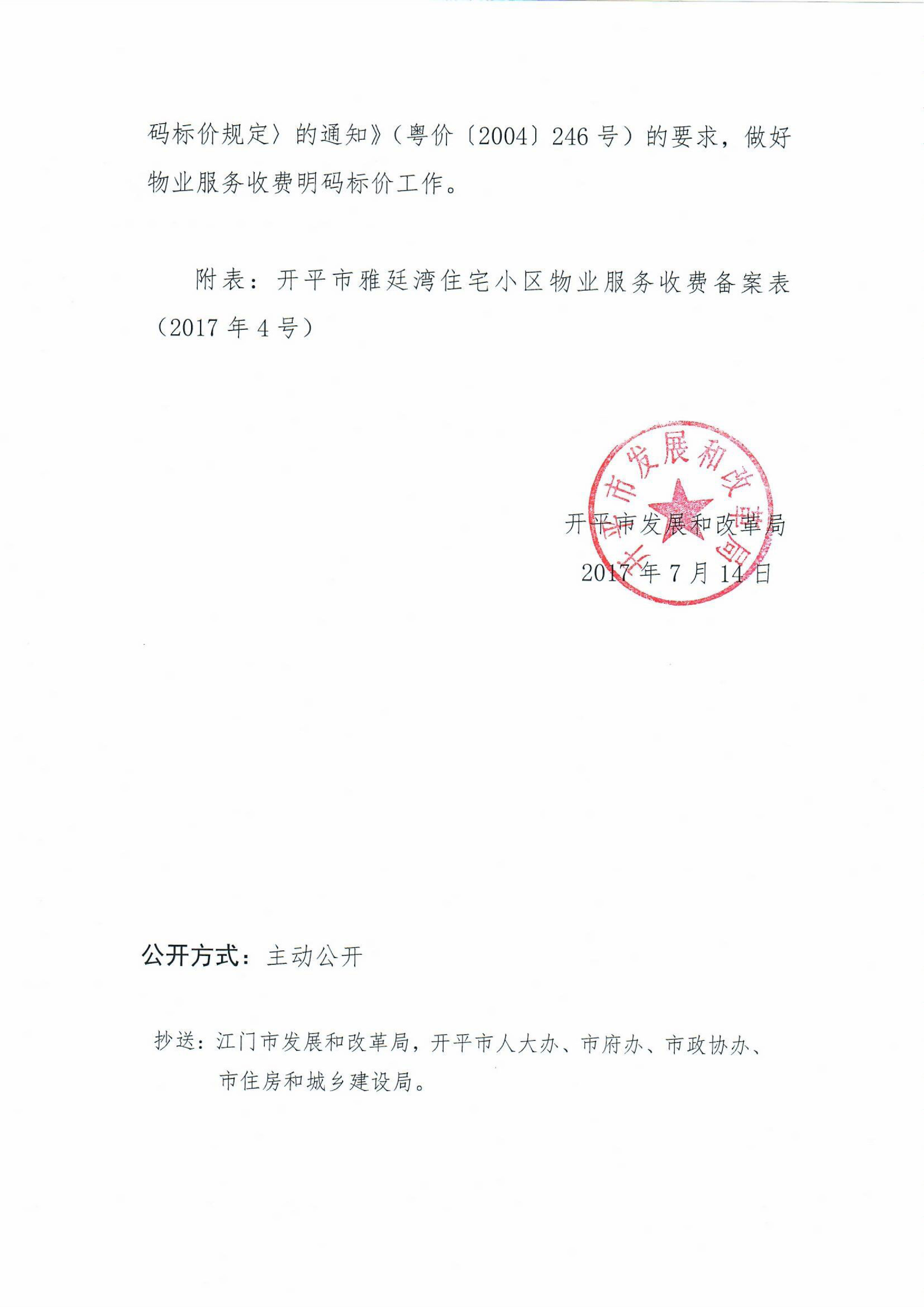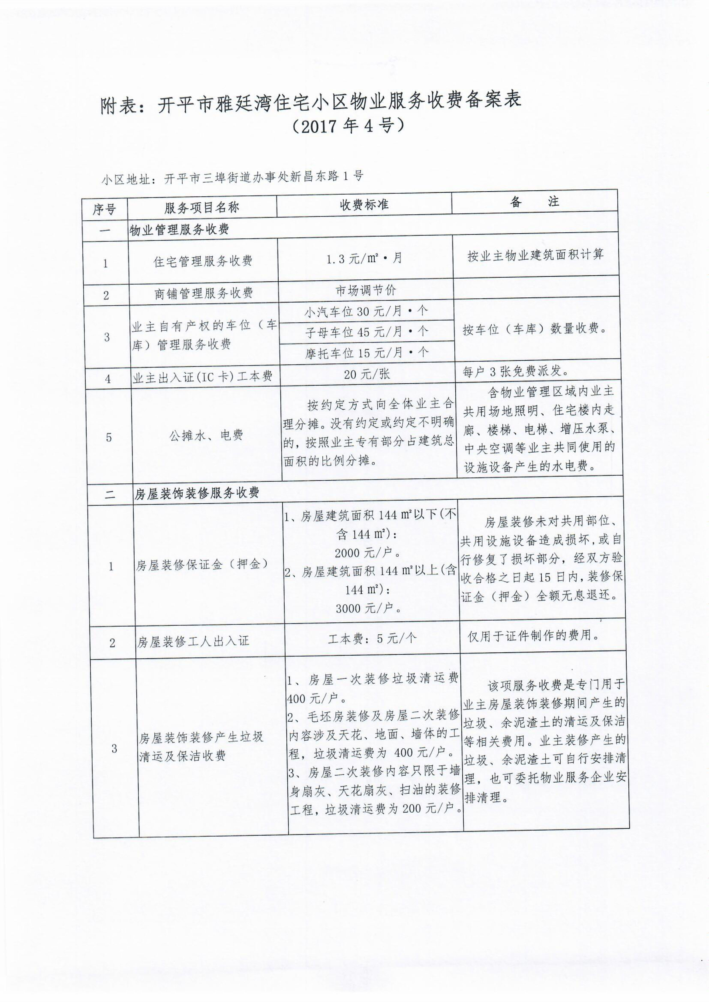 開發改價管函【2017】6號 關于對開平市雅婷灣住宅小區物業服務、房屋裝飾裝修收費的備案復函
