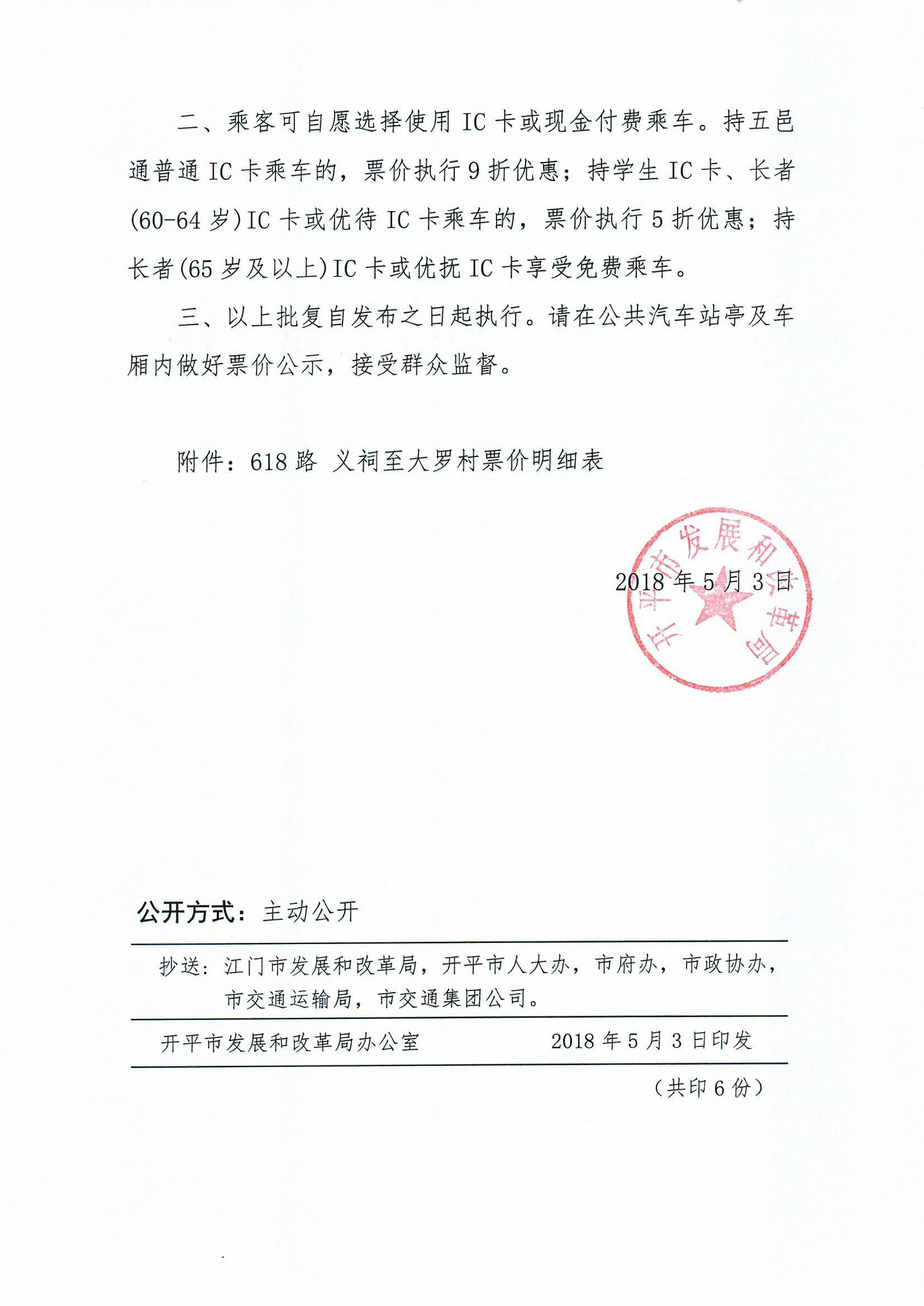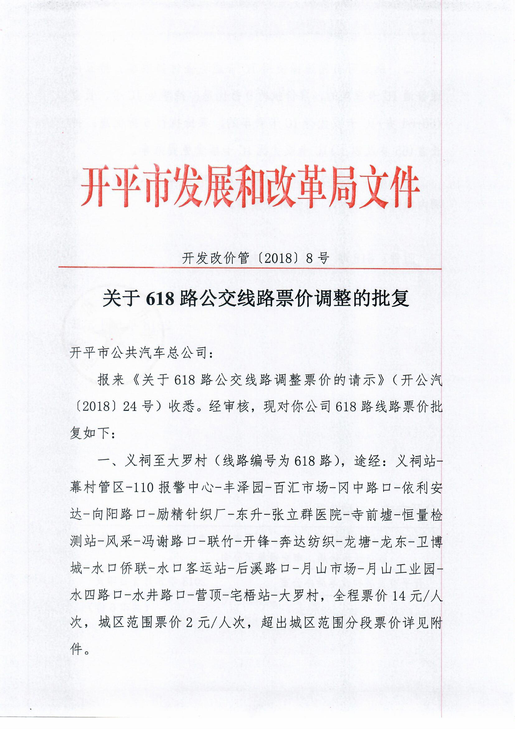 開發改價管〔2018〕8號 關于618路公交線路票價調整的批復