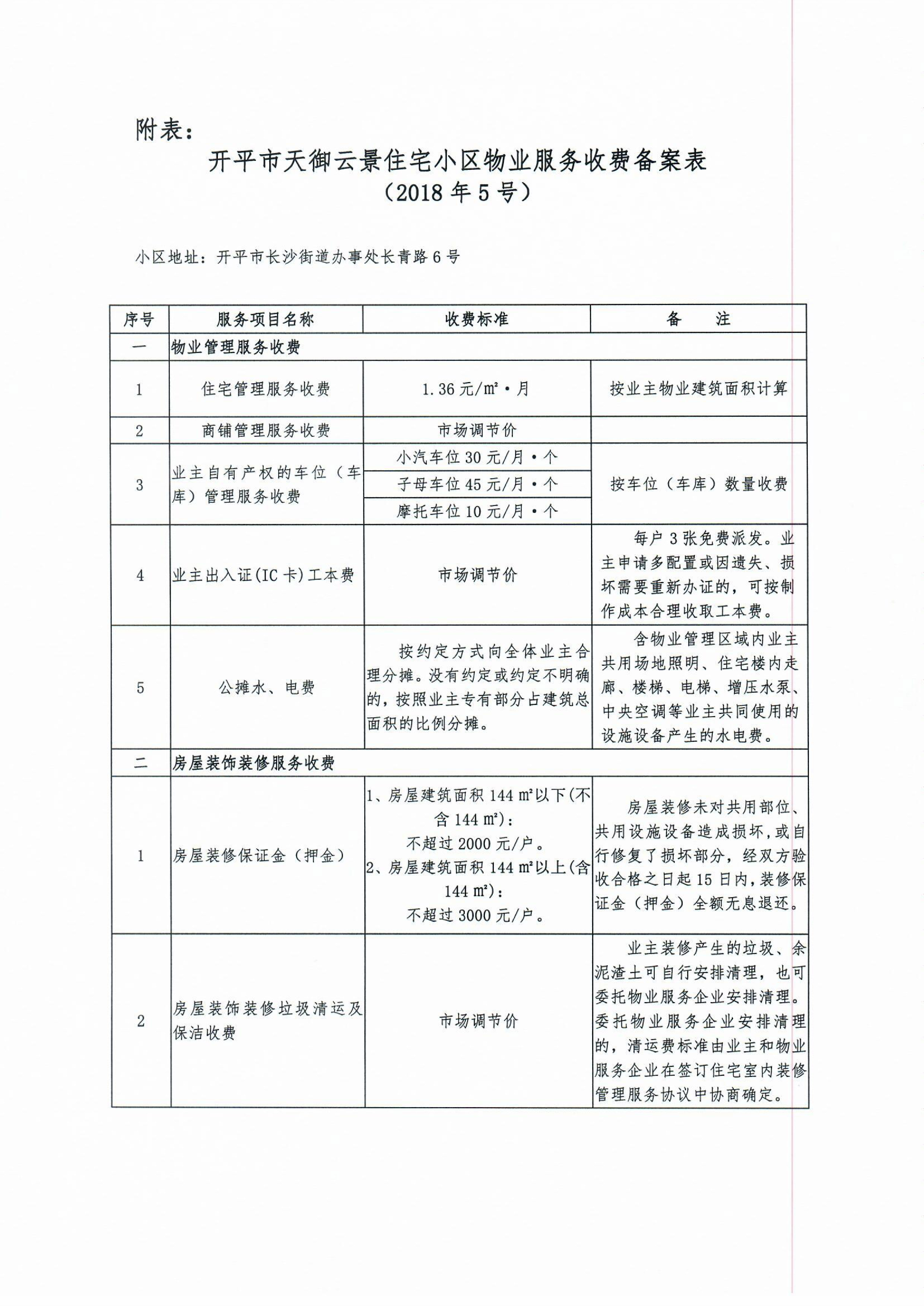 開發改價管函〔2018〕6號 關于對開平市天御云景住宅小區物業服務、房屋裝飾裝修收費的備案復函