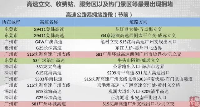 佛山羅格收費站、勒流收費站,廣州三元里收費站、廣園收費站,清遠西收費站。高速公路易堵服務區中,高峰期擁堵嚴重的是惠州長深高速泰美服務區、廣州濟廣高速沙埔服務區、肇慶二廣高速龍甫服務區、江門沈海高速梁金山服務區、河源長深高速熱水服務區、茂名沈海高速電白服務區。