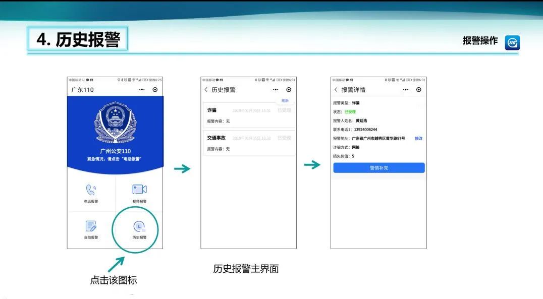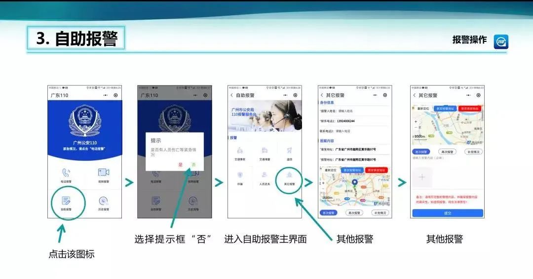 02 如何使用“廣東110”報警平臺 操作方法:點擊“電話報警”圖標,即可進入電話撥號盤,點擊撥號盤撥號按鈕即可撥打110電話連接110報警服務臺進行報警。 操作方法:點擊“視頻報警”圖標即可啟動視頻連接至110報警服務臺。 操作方法:點擊“自助報警”圖標,選擇提示框“否”(選擇“是”平臺會建議選擇“電話報警”方式進行報警)進入自助報警主界面,該界面包括“交通事故”“交通堵塞”“盜竊”“詐騙”“人員走失”等多種常見警情類別圖標。 操作方法:點擊“我的報警”進入歷史報警主界面,界面會列表顯示公安110報警記錄的自助報警、視頻報警記錄;以及交通事故上報記錄。 1 緊急情況下優先使用語音報警; 2 講不清楚情況時推薦使用視頻報警; 3 人身安全受到威脅等不方便語音報警時,可以使用靜默狀態下的自助報警,較傳統的電話報警服務功能更全面、更優化。 目前,除微信小程序外,在百度、今日頭條、南方+、支付寶、高德地圖、滴滴打車、中國移動嶺南生活等常用手機APP都能快速找到服務入口。 互聯網智能報警 相對于傳統電話報警有著明顯優勢 有自動定位 多媒體交互等功能 有效解決報警人“講不清”、 “不好找”的問題 如遇到危急情況不要慌張 根據不同的境遇 選擇不同的報警方式 蜀黍會以最快的速度 到達你的身邊
