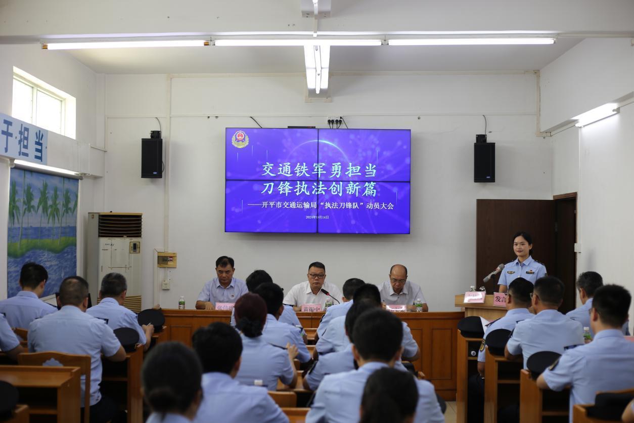 為進(jìn)一步深化“2024交通執(zhí)法規(guī)范年”建設(shè),爭當(dāng)交通執(zhí)法規(guī)范化建設(shè)排頭兵,彰顯交通鐵軍沖鋒在前的擔(dān)當(dāng)作為,9月14日上午,市交通運(yùn)輸局舉行執(zhí)法刀鋒隊(duì)動(dòng)員會(huì)及啟動(dòng)儀式。江門市交通運(yùn)輸局黨組成員、副局長黃振中,開平市人民政府辦公室二級(jí)主任科員鄺寶柔,開平市交通運(yùn)輸局黨組書記、局長張偉雄,江門市交通運(yùn)輸局、開平市公安局交通警察大隊(duì)以及開平市交通運(yùn)輸局執(zhí)法刀鋒隊(duì)全體隊(duì)員參加了動(dòng)員會(huì)及啟動(dòng)儀式。