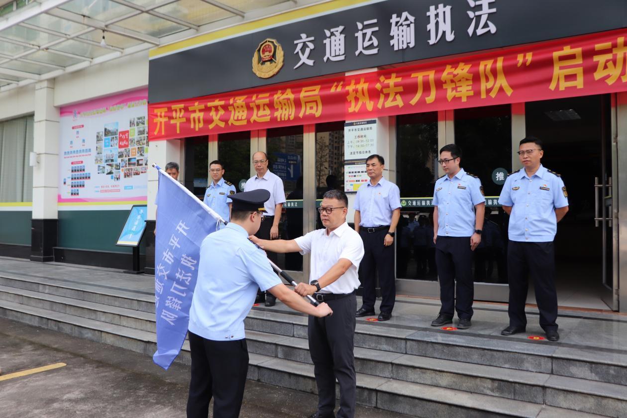 儀式上,江門市交通運(yùn)輸局黨組成員、副局長黃振中宣布開平市交通運(yùn)輸局執(zhí)法刀鋒隊(duì)正式成立,并為執(zhí)法刀鋒隊(duì)授旗,參會(huì)領(lǐng)導(dǎo)共同按響汽笛。伴隨著“交通鐵軍勇?lián)?dāng),刀鋒執(zhí)法創(chuàng)新篇”嘹亮口號(hào),開平市交通運(yùn)輸局執(zhí)法刀鋒隊(duì)全面展開執(zhí)法行動(dòng)。