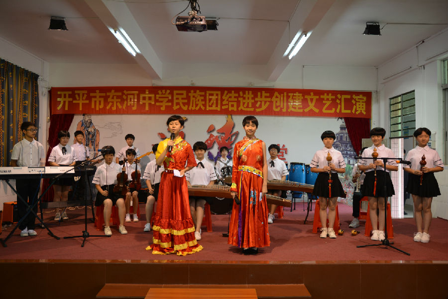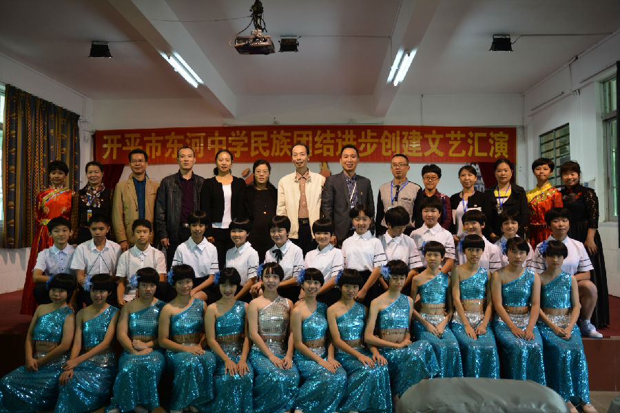 檢查組參觀了東河中學校園文化,觀看了東河中學“促進民族團結”的宣傳專欄、“民族大團結”專題學生美術作品展、富有民族特色的音樂舞蹈演出等。具有濃郁民族特色的美術作品和音樂舞蹈的演出贏得了檢查組的一致贊賞。隨后,集中會議室查閱相關資料和聽取報告,東河中學劉權均副校長做了題為《凝聚民族情奏響團結歌》的工作匯報。開平市宗教局陳月嫦局長、開平市教育局基教股室負責人鄺學良同志分別作了講話。