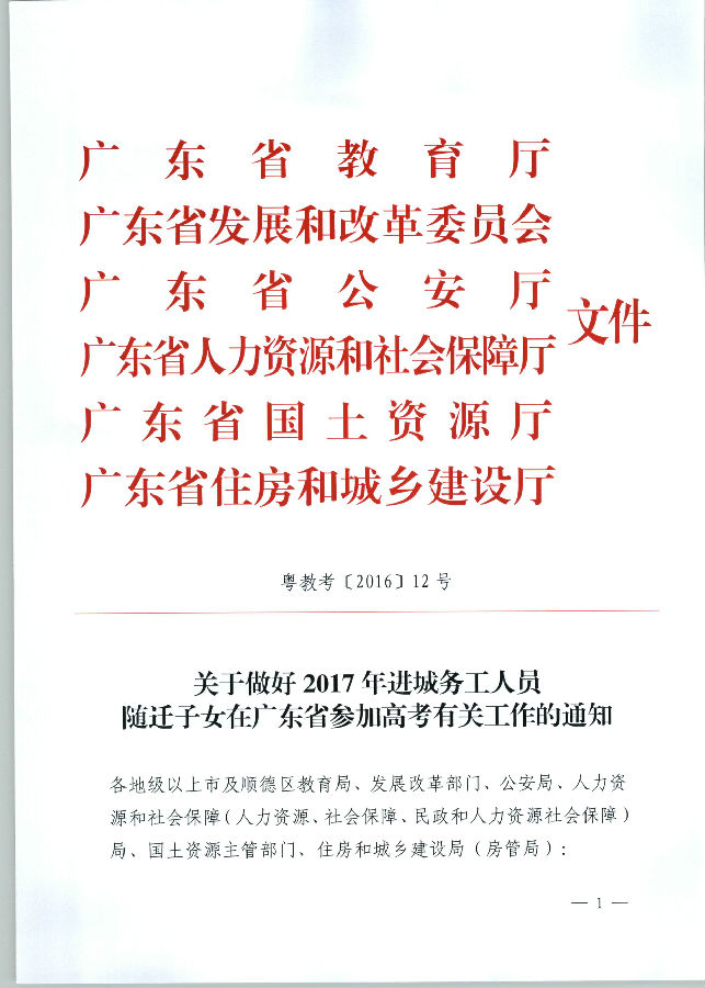 關(guān)于做好2017年進(jìn)城務(wù)工人員隨遷子女在廣東省參加高考有關(guān)工作的通知