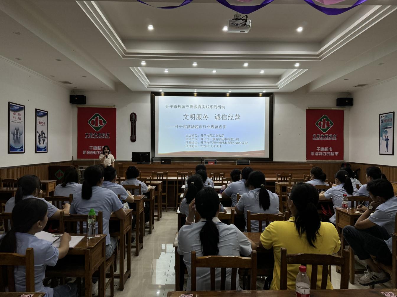 為培育和踐行社會主義核心價值觀,構(gòu)建文明和諧的經(jīng)營秩序,營造誠信守法的市場氛圍,2024年11月14日,開平市科工商務(wù)局在開平市千惠連鎖超市有限公司開展以“文明服務(wù) 誠信經(jīng)營”為主題的商場超市行業(yè)規(guī)范守則教育實踐活動,開平市千惠連鎖超市有限公司約30名員工參加活動。