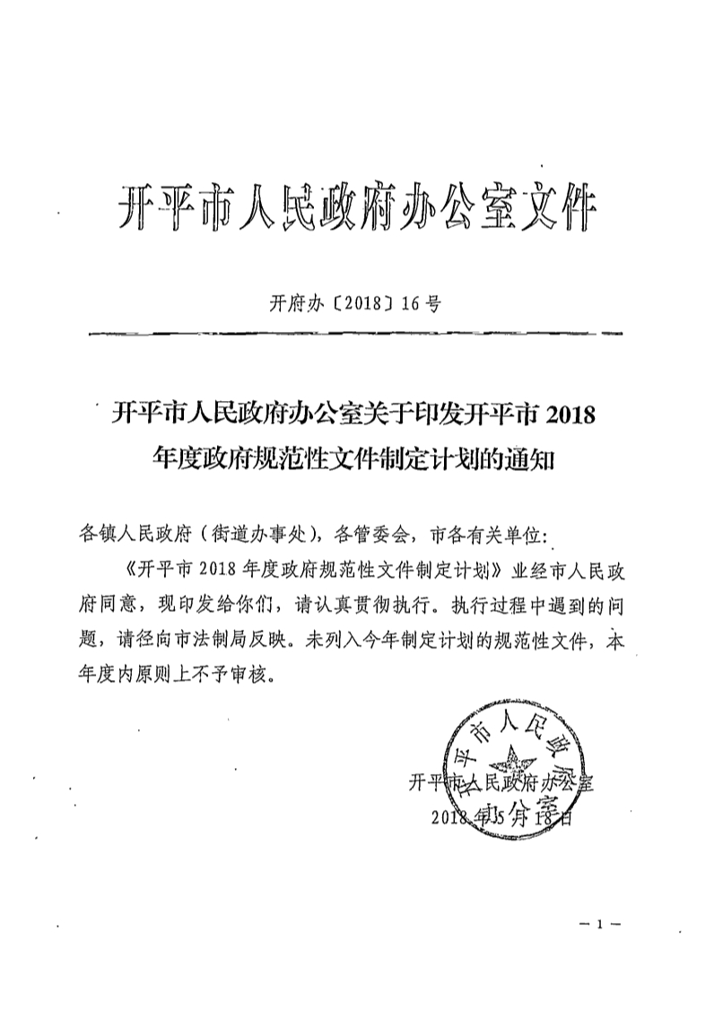開平市人民政府辦公室關于印發開平市2018年度政府規范性文件制定計劃的通知