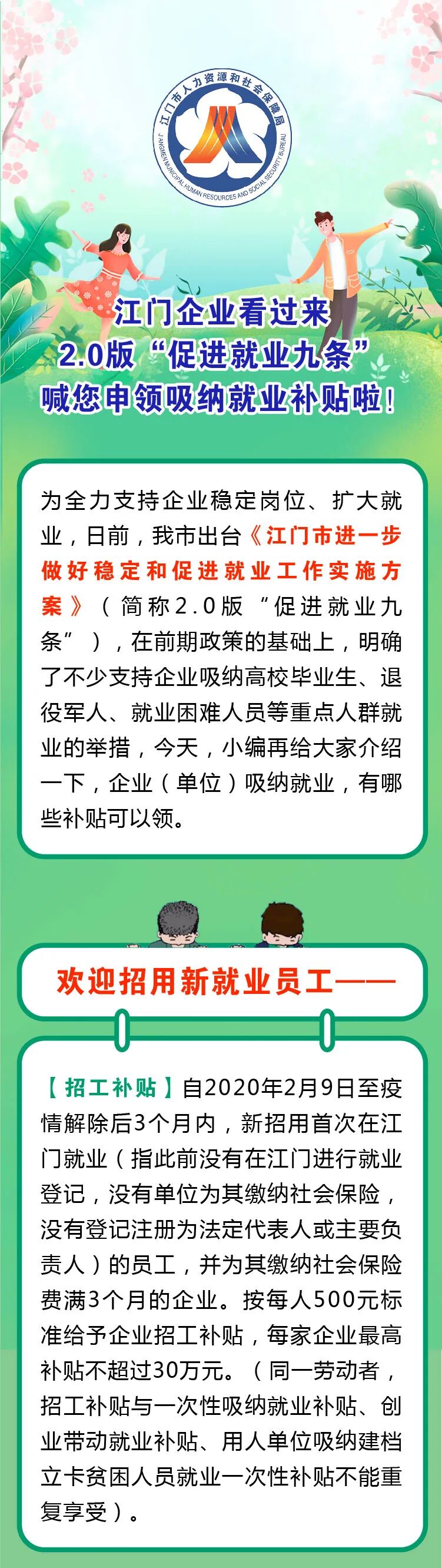 【擴散周知】@江門企業看過來,2.0版“促進就業九條”喊您申領吸納就業補貼啦!