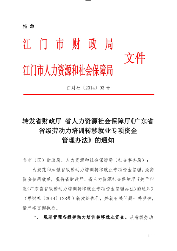江財社[2014]93號_轉發省財政廳 省人力資源社會保障廳《廣東省省級勞動力培訓轉移就業專項資金管理辦法》的通知_1514608383398.zip