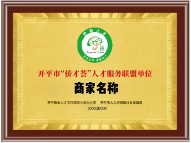 一、獲得開平市委人才工作領導小組辦公室、開平市人力資源和社會保障局等部門聯合頒發的“僑才薈”人才服務聯盟商家授權銘牌,您可在合法合規的前提下進行宣傳使用,以此提升品牌知名度,吸引更多商業機遇。