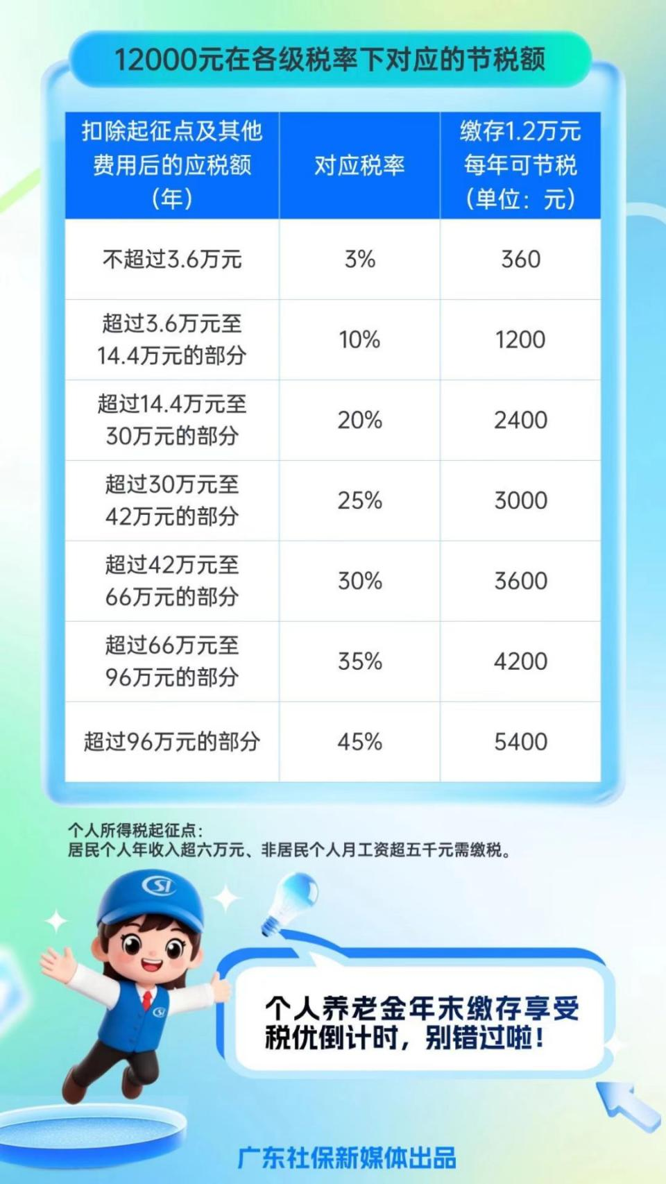 除了“靈活領(lǐng)取”,個人養(yǎng)老金還能幫您省個稅!在年度個稅匯算時,您繳納的個人養(yǎng)老金金額(每年最高12000元)可從應(yīng)納稅所得額中扣除,減少您的個稅負擔。具體節(jié)稅額可參考下圖: