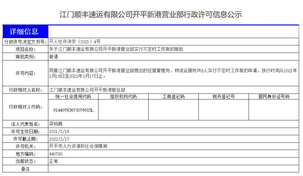 江門順豐速運有限公司開平新港營業部行政許可信息公示