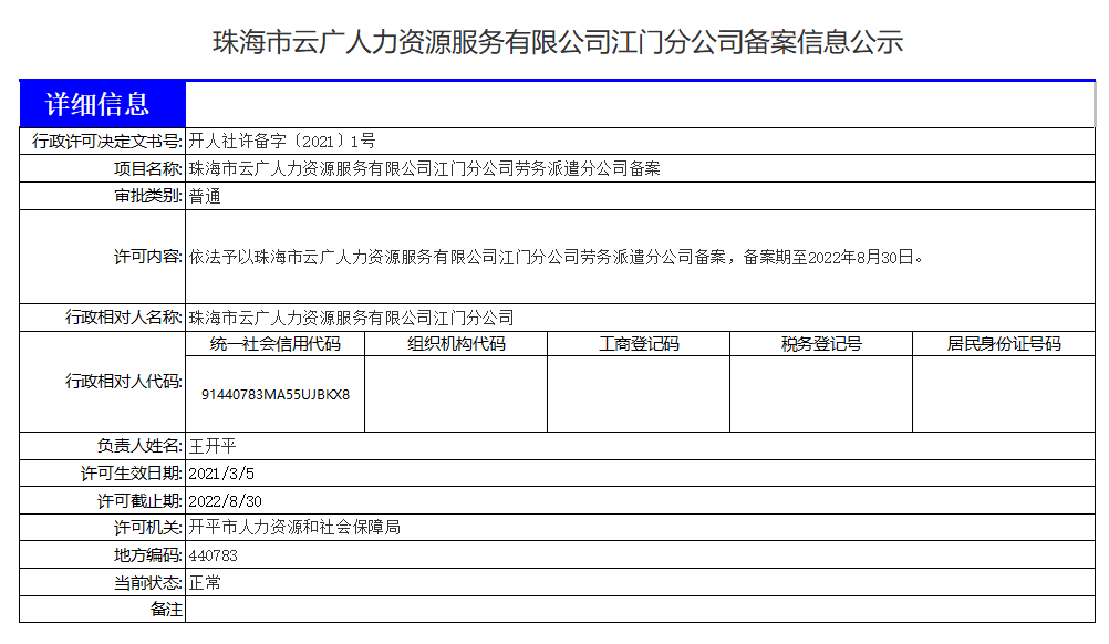 珠海市云廣人力資源服務有限公司江門分公司備案信息公示