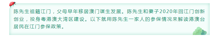 第二類:靈活就業(yè)人員(含無(wú)雇工的個(gè)體戶)。此類人員辦理廣東省就業(yè)登記證明,可自行選擇購(gòu)買職工基本養(yǎng)老保險(xiǎn)或職工基本醫(yī)療保險(xiǎn)。持港澳臺(tái)居民居住證可在我市稅務(wù)大廳辦理參加企業(yè)職工基本養(yǎng)老保險(xiǎn)或職工基本醫(yī)療保險(xiǎn)登記。陳先生的妻子隨陳先生到江門居住生活,日常除了照顧家庭、教育子女外,還是獨(dú)立化妝師,她在辦理港澳臺(tái)居民居住證后,即可選擇參加職工基本養(yǎng)老保險(xiǎn)或職工基本醫(yī)療保險(xiǎn)。