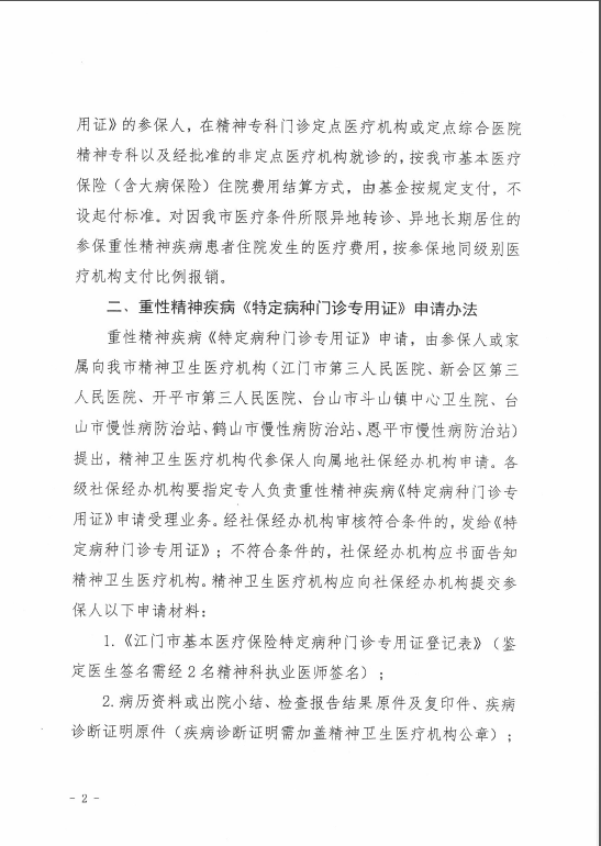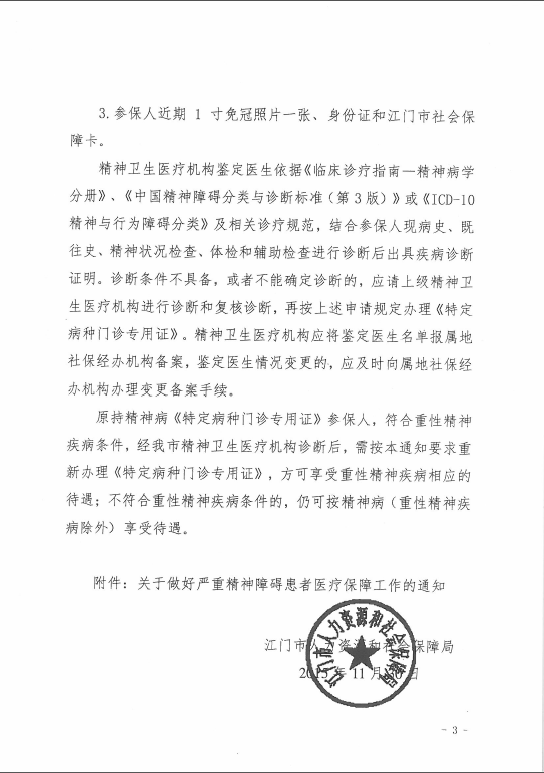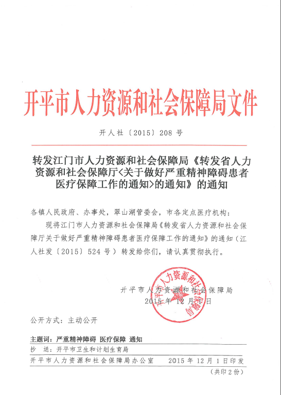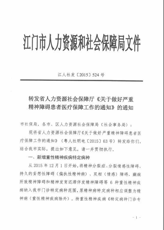 轉發江門市人力資源和社會保障局《轉發省人力資源和社會保障廳《關于做好嚴重精神障礙患者醫療保障工作的通知》的通知》的通知
