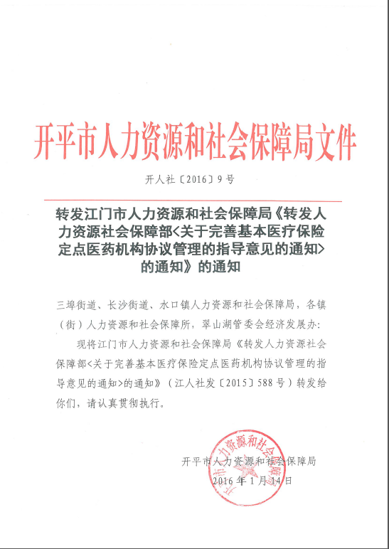 轉發江門市人力資源和社會保障局《轉發人力資源社會保障部 <關于完善基本醫療保險定點醫藥機構協議管理的指導意見的通知> 的通知》的通知 關于完善基本醫療保險定點醫藥機構協議管理的指導意見的通知>