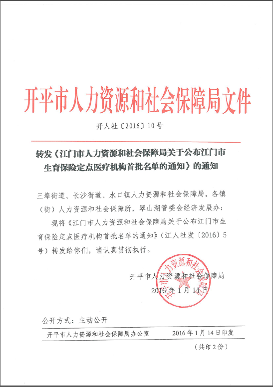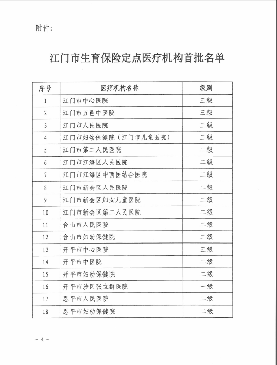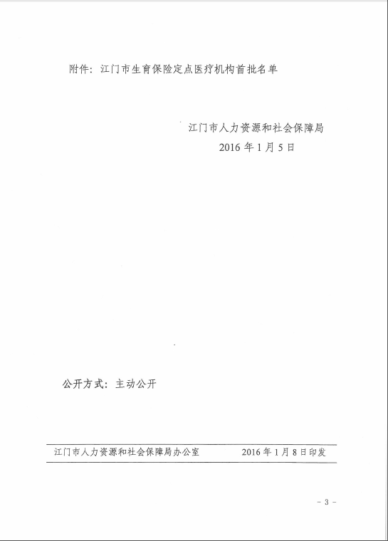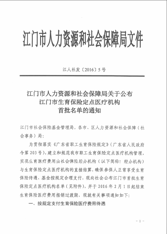 轉發《江門市人力資源和社會保障局關于公布江門市生育保險定點醫療機構首批名單的通知》的通知