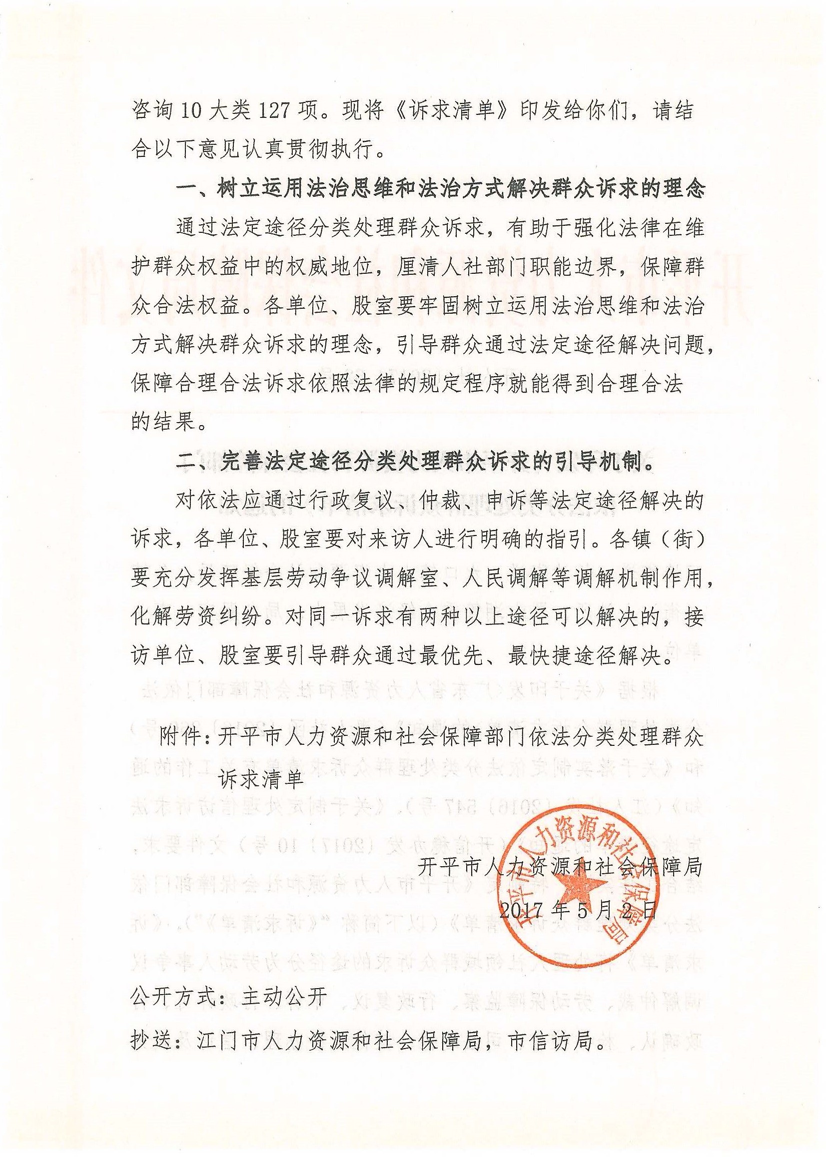 開人社【2017】62號 關于印發《開平市人力資源和社會保障部門依法分類處理群眾訴求清單》的通知