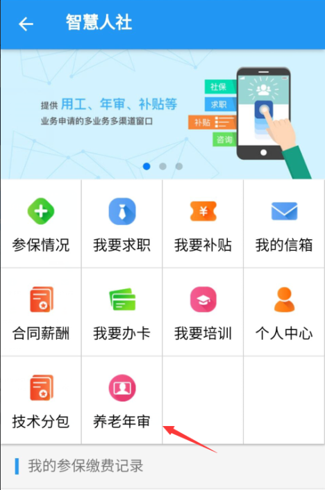 (四)綁定成功后進(jìn)入首頁,點(diǎn)擊“養(yǎng)老年審”功能按鈕進(jìn)入年審界面。