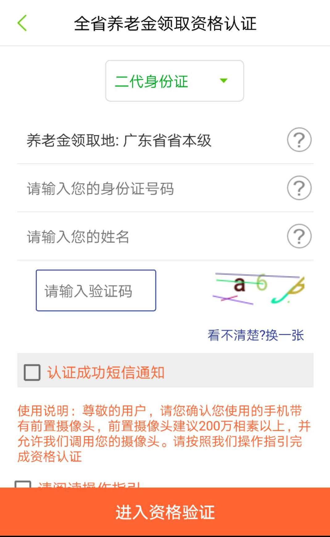 2.選擇養(yǎng)老金領(lǐng)取地,輸入二代身份證號(hào)碼,姓名,驗(yàn)證碼信息,閱讀操作指引,閱讀清楚后勾選確認(rèn),點(diǎn)擊“進(jìn)入資格認(rèn)證” 按鈕。如認(rèn)證成功需要短信通知,請選擇并填入手機(jī)號(hào)碼。