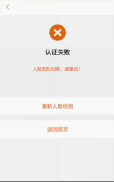 4.如果人臉檢測失敗,可點(diǎn)擊重新人臉檢測按鈕,重新檢測;如果人臉匹配失敗,可重新檢測亦可點(diǎn)擊重新人臉檢測按鈕,如需返回首頁,可點(diǎn)擊返回首頁按鈕。