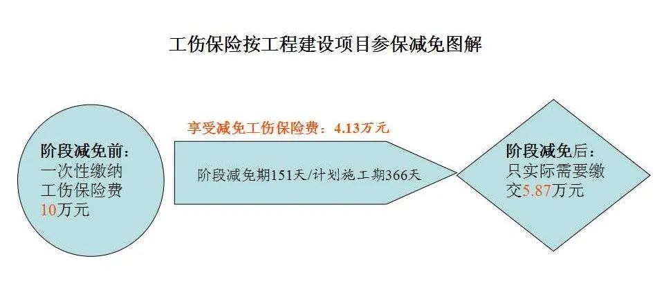 五、減免政策執行期為費款所屬期 即在此期間補繳2月份之前的社保費或躉繳減免政策期之后的社保費,均不屬減免政策范圍。 六、新開工工程建設項目 2020年2月至6月新開工的工程建設項目按國家規定進行劃型并享受相應的減免政策。 具體計算辦法:按照工程建設項目計劃施工所覆蓋的減免期占其計劃施工期的比例,折算減免工傷保險費。計劃施工期及起止日期依據備案的工程施工合同核定。由社保費征收機構在核定繳費時直接予以減免,不需申請。 舉個例子:某建筑項目的施工總承包單位屬于中型企業,該建筑工程項目從2020年2月1日計劃施工至2021年1月31日,按政策計算應一次性繳納工傷保險費10萬元。由于其屬于減免期內新開工建設項目,且施工總承包單位為中型企業,可享受階段性免征工傷保險費政策,覆蓋的減免期為5個月共151天,則該項目可享受減免工傷保險費:4.13萬元=10萬元×(階段減免期151天/計劃施工期366天)×100%,即只實際需繳5.87萬元。