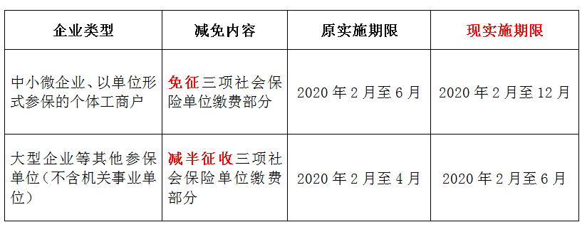業務辦理 延長階段性減免企業三項社會保險費政策實施期限后,享受減免政策仍然實行“免填單、免申請”,符合條件的用人單位在申報社會保險費時自動享受單位繳費部分的減免。 享受免征三項社會保險費的 用人單位 對于中小微企業、以單位形式參保的個體工商戶等享受免征三項社會保險單位繳費政策的用人單位,稅務機關已經將減免期限截止日期由2020年6月30日調整為2020年12月31日。您只需按照原有的業務辦理流程操作即可。 享受減半征收三項社會 保險費的用人單位 減半征收三項社會保險費政策在2020年4月就到期了,現在延長執行到6月底,那么已經繳納2020年5月和6月社會保險費的是不是要辦理退費呢?如果還沒申報繳費,又該如何操作呢? 如果您已繳納了2020年5月和6月的社保費,并已享受了減半征收的優惠,那么無需再辦理結算。 如果您已申報但未繳納社保費,系統已按規定自動減半計算應繳金額,無需作廢已申報數據,核實無誤后正常繳費即可。 如果您還未申報,那么也可以放心的申報繳費了,在申報時自動享受單位繳費部分的減免。 減半征收三項社會保險費政策將于2020年6月30日到期。自2020年7月1日起,大型企業等其他參保單位申報繳納2020年7月所屬期起(含7月)的社會保險費時,將不再享受減免優惠。用人單位應當按照政策規定,按時申報繳納社會保險費。對受疫情影響不能按時繳費的,應當按原有做法正常辦理增減員和申報,費款允許延期至疫情解除后三個月內補繳,補繳免收滯納金。 人社部發〔2020〕49號文除了明確延長階段性減免企業三項社會保險費政策實施期限外,還涉及緩繳社會保險費、2020年社會保險個人繳費基數上下限和靈活就業人員自愿暫緩繳費等規定。待我省的具體實施辦法出臺后,我們將第一時間通過“廣東稅務”微信公眾號和廣東稅務門戶網站“階段性減免企業社保費”專欄做好宣傳。