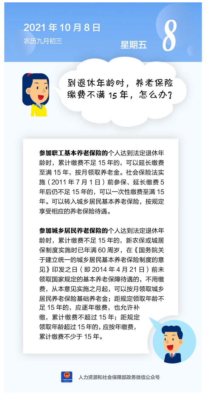 【人社普法速遞 | 第一百三十二期】到退休年齡時,養老保險繳費不滿15年,怎么辦?
