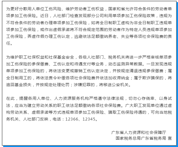 鏈接一:案例 01-廣州市海珠區(qū)查處虛構(gòu)勞動關(guān)系辦理單項參保行為 2024年1月,廣州市海珠區(qū)人社局通過核查參保人舉報線索,發(fā)現(xiàn)某人力資源服務(wù)公司通過“假外包、真掛靠”,將其他公司的全日制職工虛構(gòu)為本公司非全日制職工,簽訂虛假用工協(xié)議,違規(guī)辦理單項參加工傷保險。目前,該公司已被當?shù)厝松绮块T立案查處,并退回騙取的工傷保險待遇。 02-韶關(guān)市曲江區(qū)查處違規(guī)為非特定人員辦理單項參保行為 2023年12月起,韶關(guān)市曲江區(qū)人社局按照省市統(tǒng)一部署,開展工傷認定風險排查整治專項行動,發(fā)現(xiàn)某公司在為建立勞動關(guān)系職工辦理參保時,將“臨近退休人員”“試用期人員”“臨時工”等群體錯誤按“其他從業(yè)人員”類型單項參加工傷保險。目前稅務(wù)機關(guān)已責令該公司糾正錯誤參保關(guān)系,為存在勞動關(guān)系的職工補繳各項社會保險費,并按規(guī)定加收滯納金。 鏈接二:相關(guān)法律法規(guī) 單位違規(guī)單項參加工傷保險、違規(guī)辦理社保業(yè)務(wù),可能會承擔多個法律責任。 01-弄虛作假辦理社保業(yè)務(wù)的法律責任 參保單位在工傷認定申請中,如果提供虛假用工協(xié)議、虛假考勤資料等材料的,根據(jù)《廣東省社會保險基金監(jiān)督條例》第六十一條處理處罰。 第六十一條 以欺詐、偽造證明材料、冒用他人證件、虛構(gòu)勞動關(guān)系等手段辦理社會保險業(yè)務(wù)的,社會保險行政部門、社會保險費征收機構(gòu)、社會保險經(jīng)辦機構(gòu)不予辦理,將有關(guān)情況記入其信用檔案;情節(jié)嚴重的,處涉案金額一倍以上三倍以下的罰款。以欺詐、偽造證明材料、虛構(gòu)勞動關(guān)系或者其他手段騙取社會保險待遇的,由社會保險行政部門責令退還已騙取的社會保險待遇,并處騙取金額二倍以上五倍以下的罰款。 02-未依法開展人力資源服務(wù)的法律責任 人力資源服務(wù)機構(gòu)如果將用人單位職工改變?yōu)楸緳C構(gòu)的職工,串通損害職工合法權(quán)益的,根據(jù)《人力資源市場暫行條例》第四十三條規(guī)定處理處罰。 第三十條 經(jīng)營性人力資源服務(wù)機構(gòu)接受用人單位委托提供人力資源服務(wù)外包的,不得改變用人單位與個人的勞動關(guān)系,不得與用人單位串通侵害個人的合法權(quán)益。 第四十三條 違反本條例...第三十條...規(guī)定,...未依法開展人力資源服務(wù)業(yè)務(wù)的,由人力資源社會保障行政部門責令改正;有違法所得的,沒收違法所得;拒不改正的,處1萬元以上5萬元以下的罰款;情節(jié)嚴重的,吊銷人力資源服務(wù)許可證;給個人造成損害的,依法承擔民事責任。違反其他法律、行政法規(guī)的,由有關(guān)主管部門依法給予處罰。 03-未按時足額繳納社會保險費的法律責任 如用人單位違規(guī)只為建立勞動關(guān)系的職工選擇參加工傷保險,未按時足額繳納養(yǎng)老、醫(yī)療、失業(yè)等社會保險費的,根據(jù)《社會保險法》第八十六條規(guī)定加收滯納金、罰款。 第八十六條 用人單位未按時足額繳納社會保險費的,由社會保險費征收機構(gòu)責令限期繳納或者補足,并自欠繳之日起,按日加收萬分之五的滯納金;逾期仍不繳納的,由有關(guān)行政部門處欠繳數(shù)額一倍以上三倍以下的罰款。 04-騙保的法律責任 參保單位通過將發(fā)生工傷的“老職工”偽造為新入職職工參保,或者在申領(lǐng)工傷保險待遇時提供虛假墊付醫(yī)療費用說明等方式,騙取工傷保險待遇的,根據(jù)《社會保險法》第八十八條處罰,達到規(guī)定金額的,依法追究刑事責任。 第八十八條 以欺詐、偽造證明材料或者其他手段騙取社會保險待遇的,由社會保險行政部門責令退回騙取的社會保險金,處騙取金額二倍以上五倍以下的罰款。 第九十四條 違反本法規(guī)定,構(gòu)成犯罪的,依法追究刑事責任。 解讀:開平市人力資源和社會保障局執(zhí)法一大隊 咨詢方式:0750-2257325