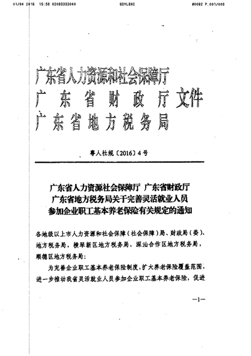 粵人社規[2016]4號 關于完善靈活就業人員參加企業職工基本養老保險有關規定的通知
