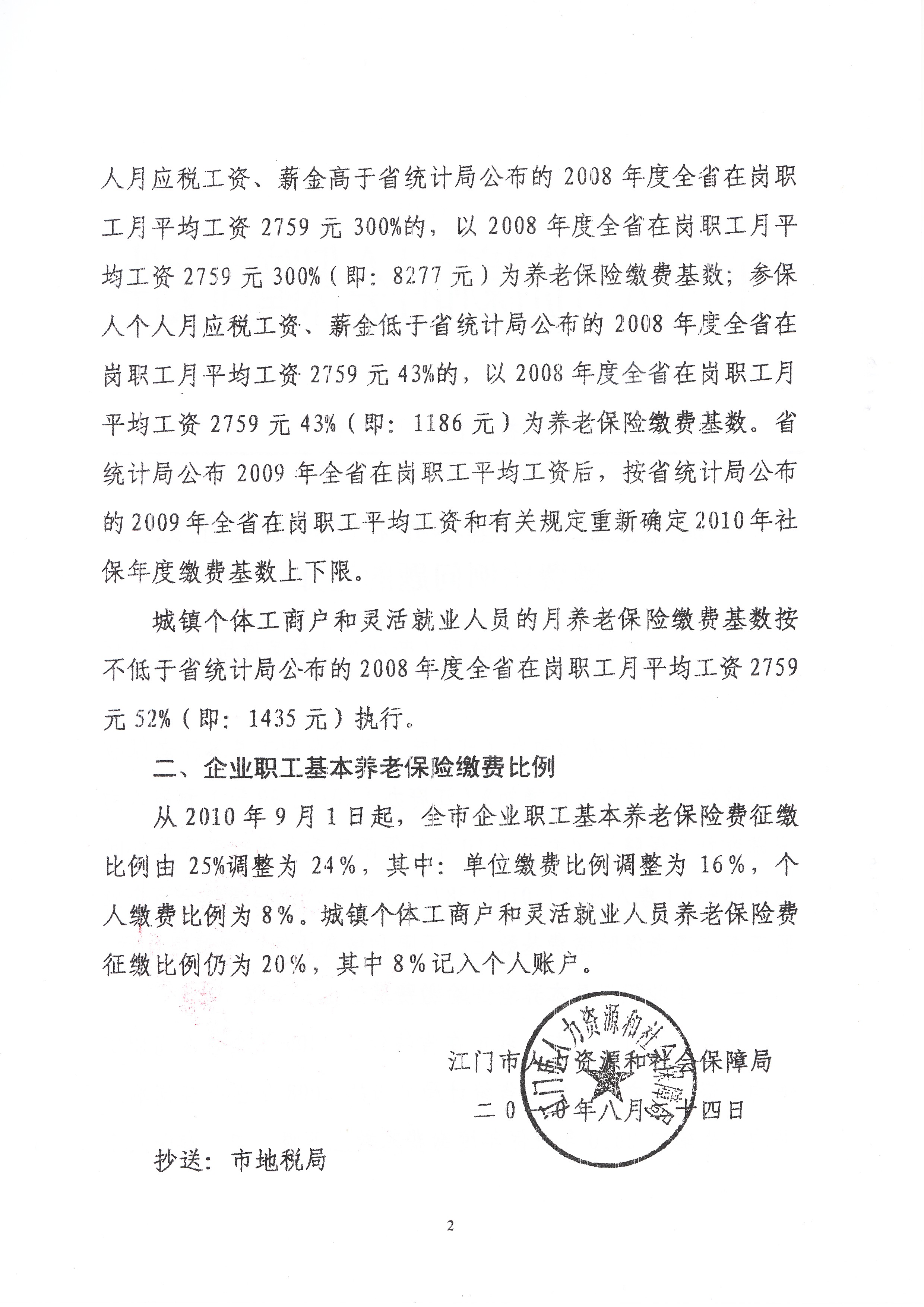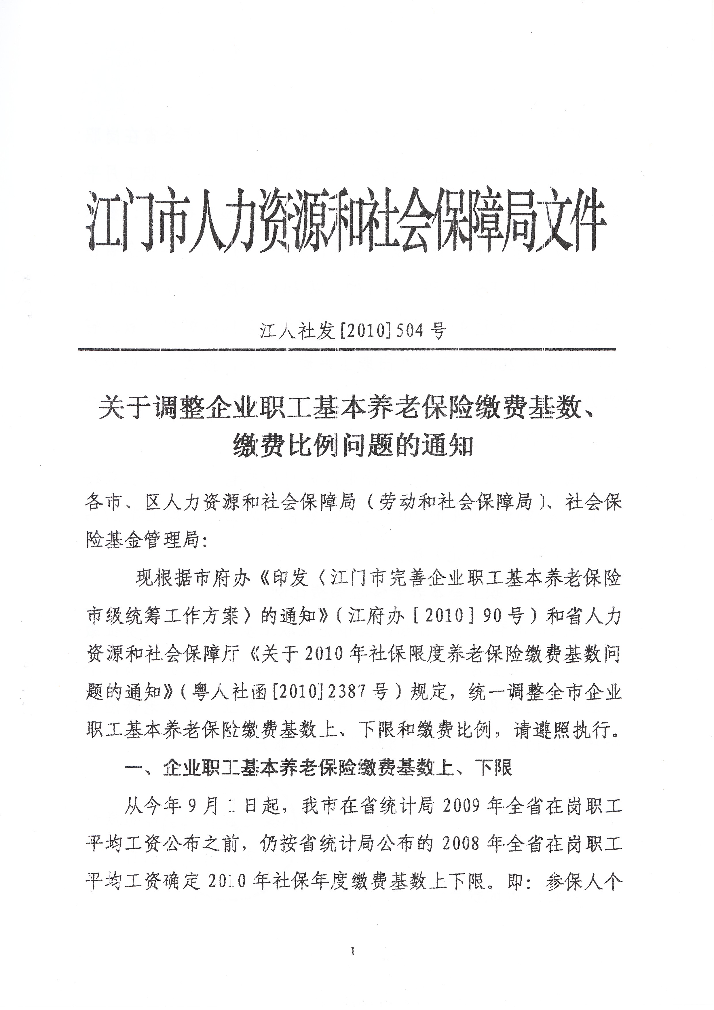轉發江門市人力資源和社會保障局《關于調整企業職工基本養老保險繳費基數、繳費比例問題的通知》的通知(開人社[2010]46號)