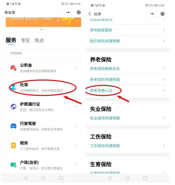 1.可辦理:企業(yè)職工養(yǎng)老保險待遇資格認(rèn)證(即退休年審)業(yè)務(wù)。2.操作指引:參保人通過智能手機在微信上搜索“粵省事”小程序-在服務(wù)專區(qū)選擇“社保”板塊-點擊“登錄”,通過個人身份認(rèn)證后,選擇“養(yǎng)老保險”-點擊“養(yǎng)老資格認(rèn)證”-點擊“城鎮(zhèn)職工社保”-點擊“本人辦理”或“為他人代辦”,并輸入對應(yīng)的姓名和身份證號碼-進(jìn)行人臉識別認(rèn)證。