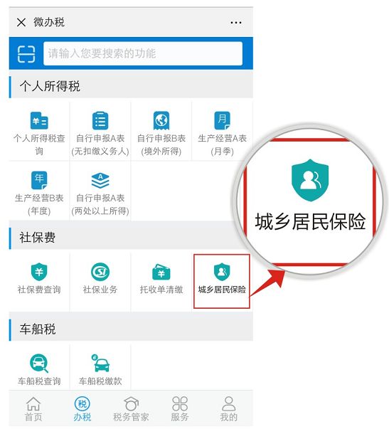 然后選擇“【微辦稅】--【個人業務】--【城鄉居民保險】--【城鄉居民保險清繳】。
