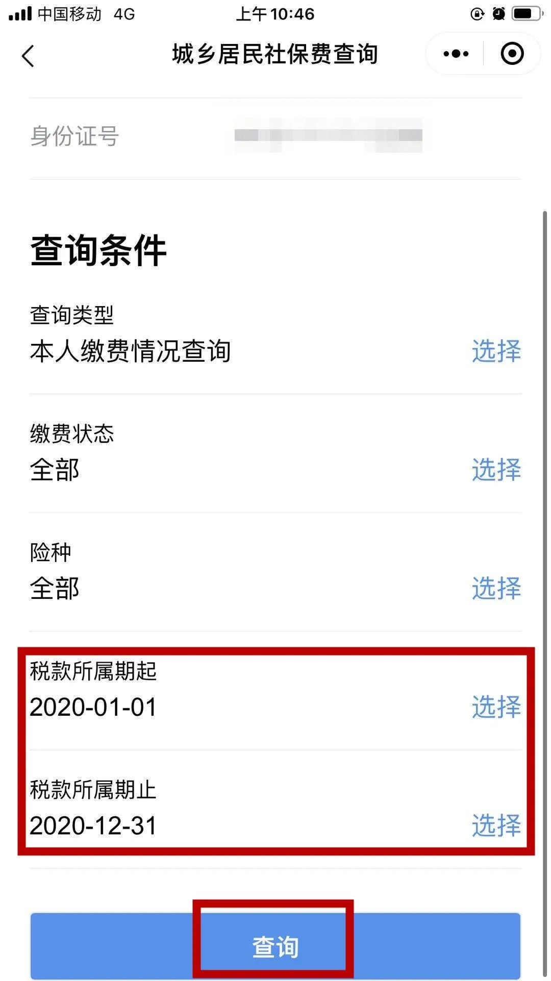 認證完成后,點擊【城鄉居民社保】,選擇【城鄉居民社保費查詢】,選擇險種、所屬期起止日期,即可查詢。