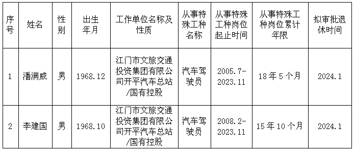 根據《關于規范特殊工種提前退休審批工作有關問題的通知》(粵勞社〔2002〕136號),經初步審核,潘滿威等2人符合特殊工種提前退休條件,擬同意辦理提前退休手續,現將有關情況予以公示(見附表)。