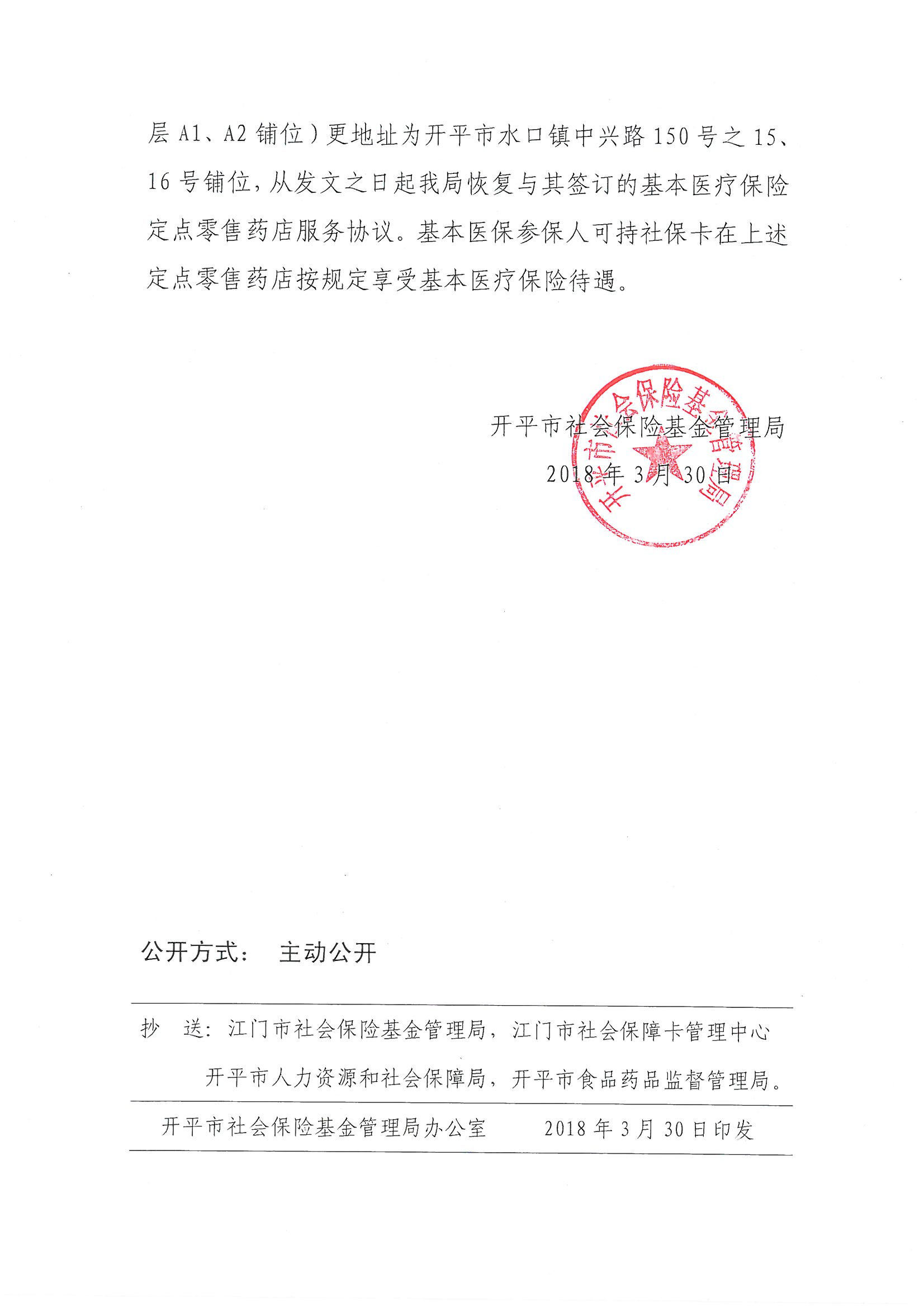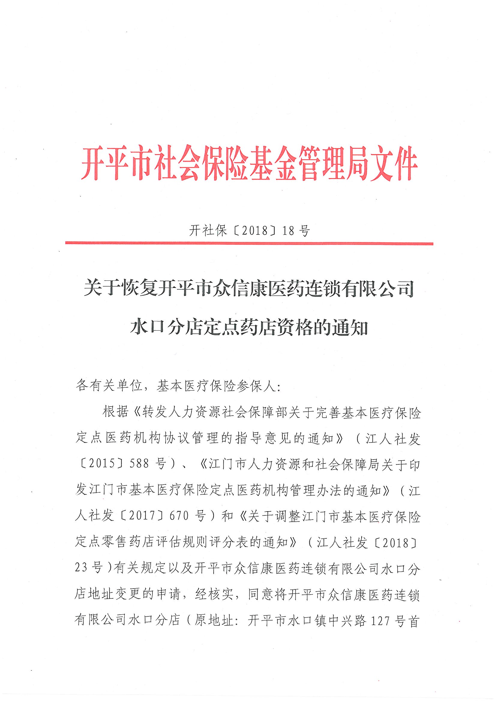 關于恢復開平市眾信康醫藥連鎖有限公司水口分店定點藥店資格的通知